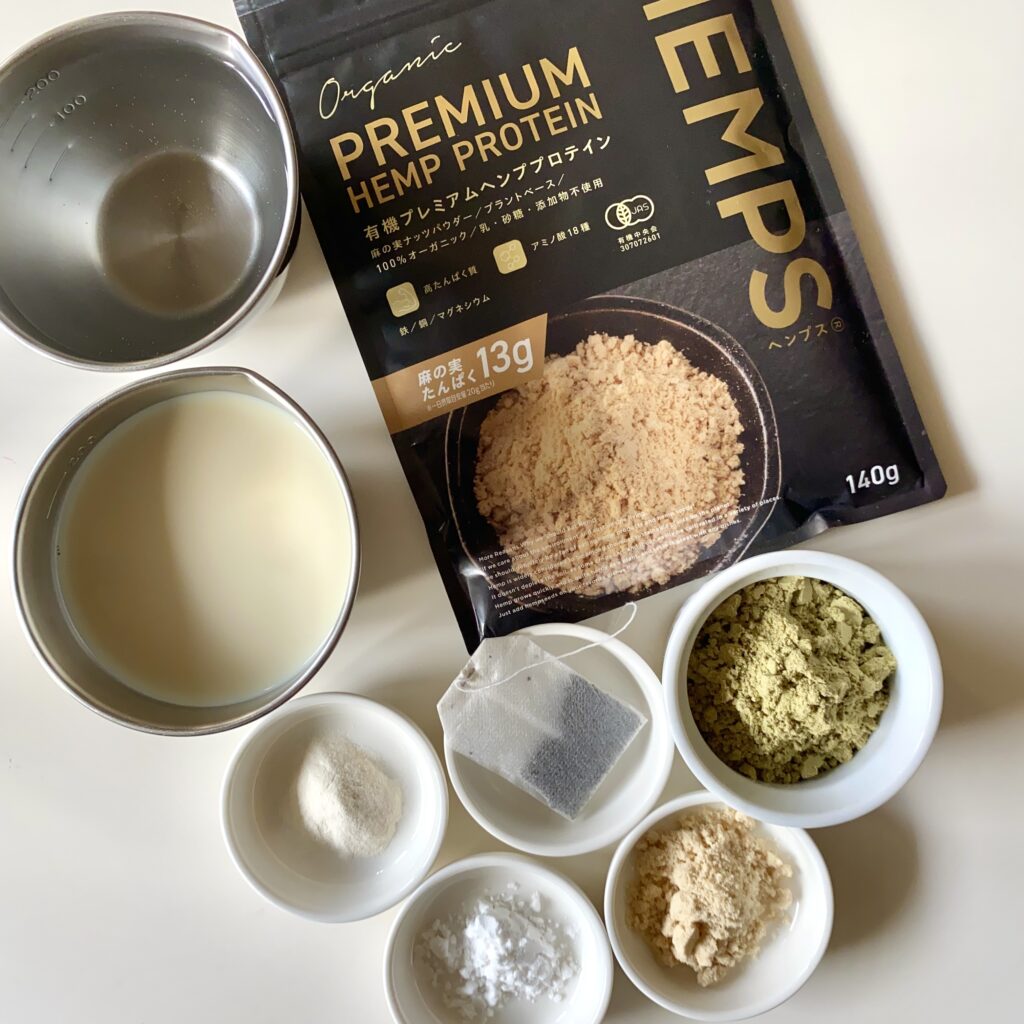 ③シェイカーに豆乳を入れ、紅茶を加えて人肌程度の温度になったところに、ヘンププロテインを加える。