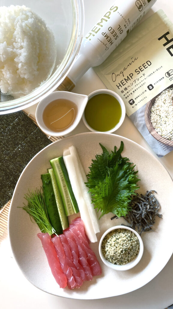 すし飯にヘンプシードをまんべんなく散らし、中央より少し下に青じそを敷き、その上に、マグロ・たくあん・きゅうりをのせ、芽葱と塩昆布を添える。